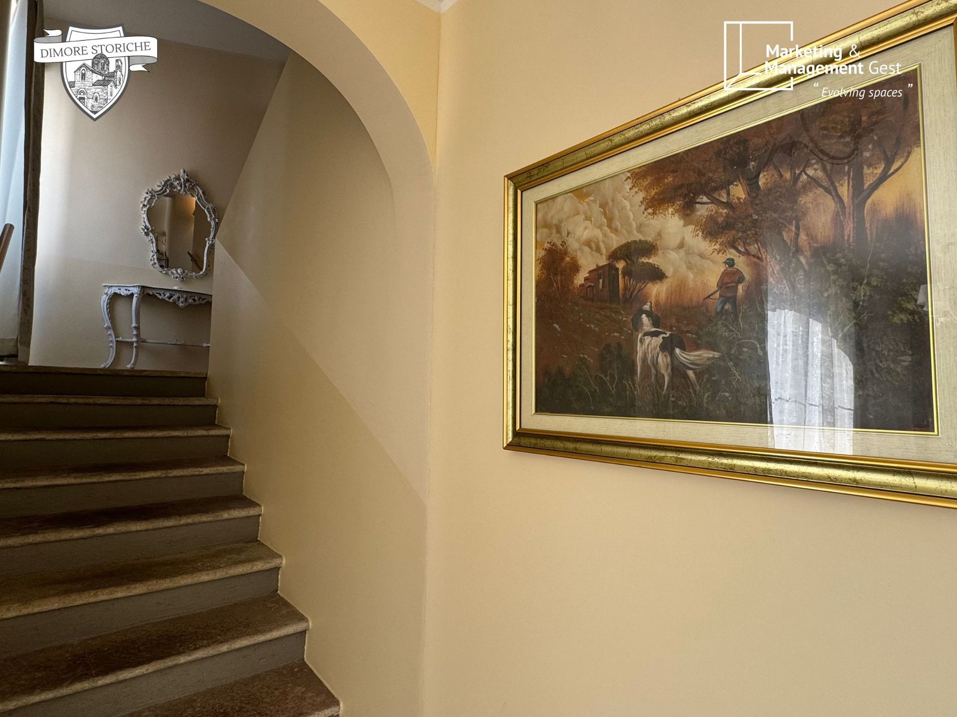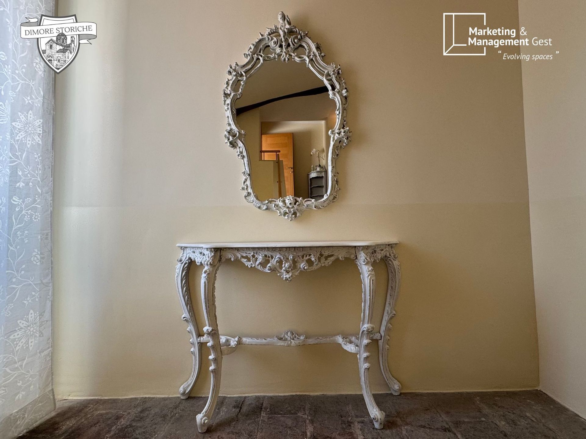 Il bagno ospiti, in ricercato arredamento in stile classico, è dotato di lavandino, wc, bidet, doccia, una caratteristica nicchia a muro e finestra a lucernaio.