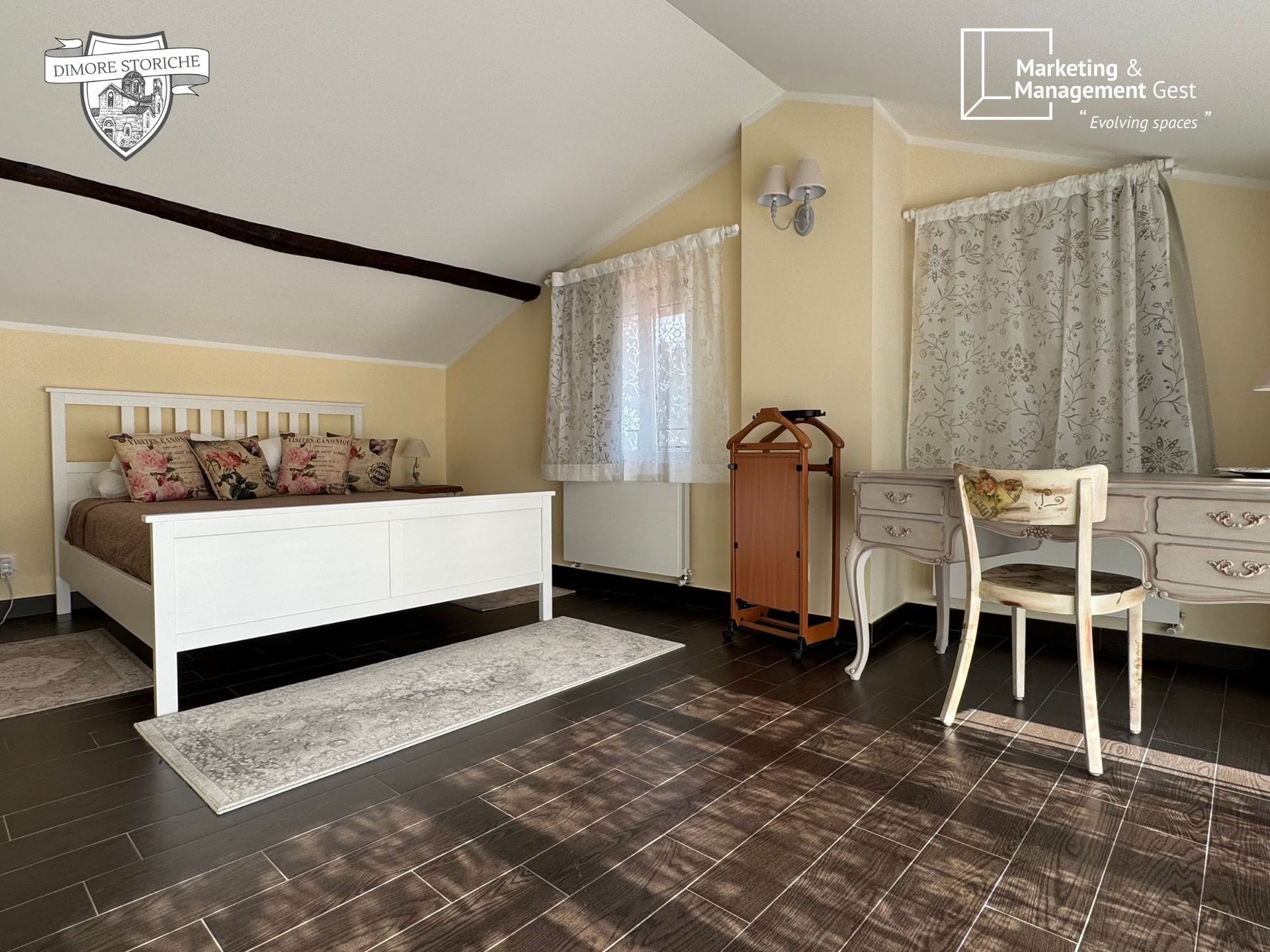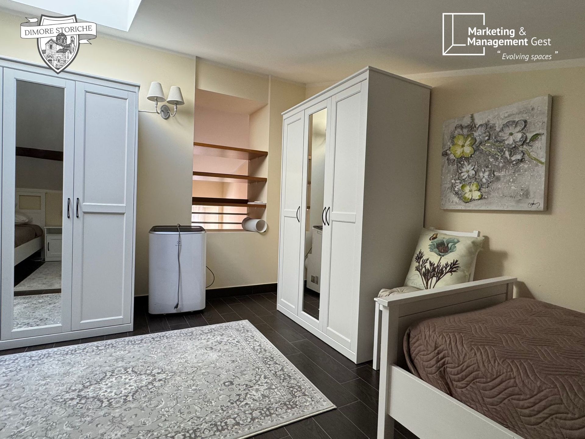 La visita all’appartamento prosegue attraverso la seconda camera da letto, di metratura generosa caratterizzata dalla presenza di una trave originale a vista, un’ampia finestra a lucernaio ed una nicchia incastonata nel muro.
